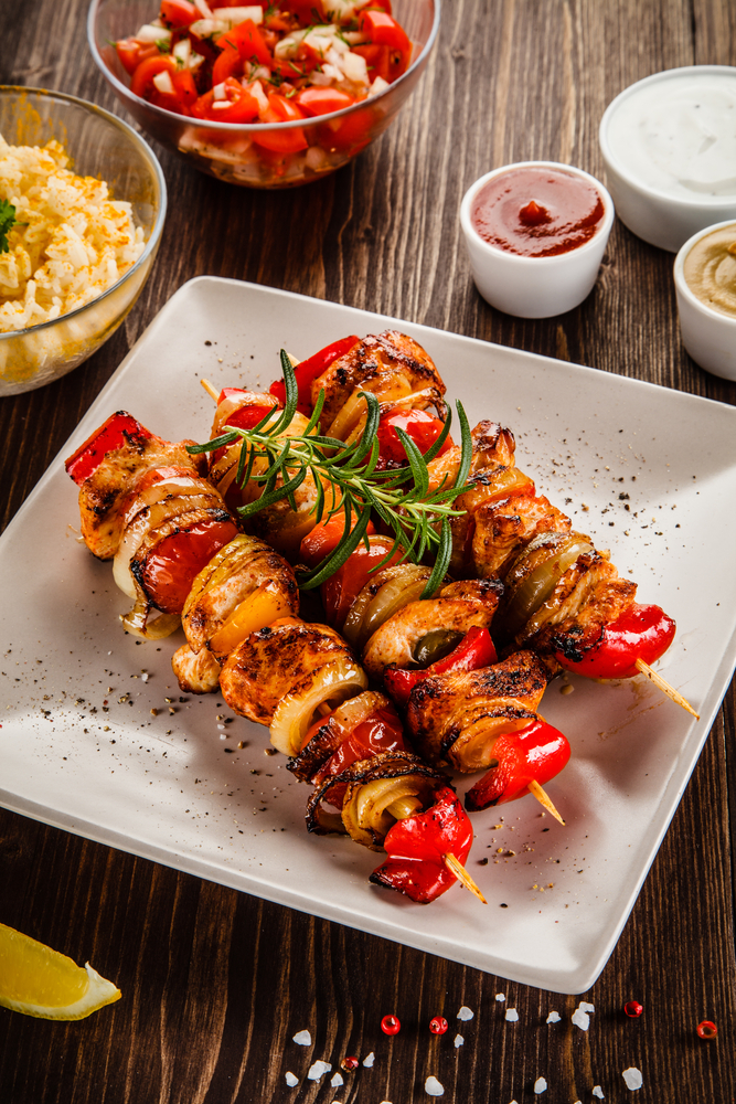 - Нарежьте овощи и насаживайте всё на шпажки.