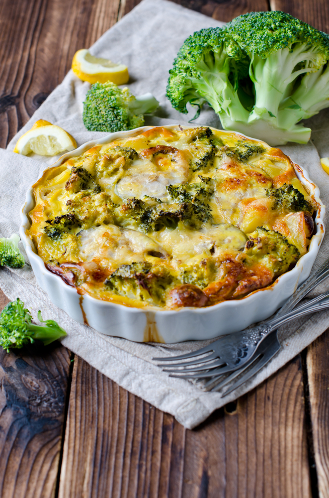 - Залейте сливками, добавьте специи и посыпь сыром.