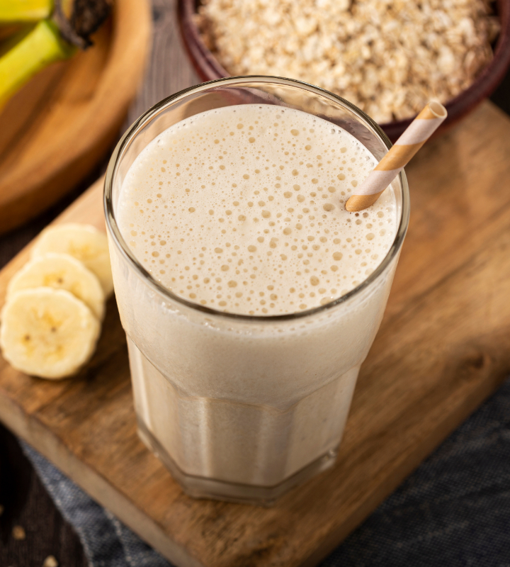 Очистите банан от кожуры и поместите его в чашу блендера. Добавьте творог, молоко, овсяные хлопья, сахар или мёд, затем плотно закройте крышку блендера.